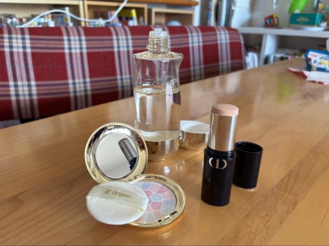 私の普段のスキンケアとメイクは、化粧水&乳液。少し時間をおいて、UVカットのできる下地&ファンデーション。ここにパウダーをはたいて、だいたいの場合ポイントメイクを足す。