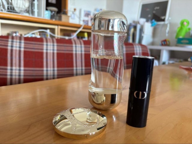 右下から反時計回りに、ディオールのファンデーション、イプサの化粧水、エレガンスのパウダー