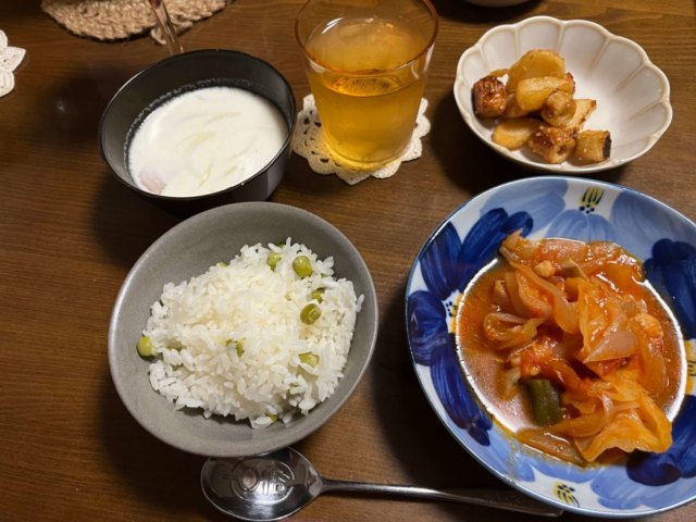 たとえば、久しぶりに食べたグリーンピースごはんは給食を思い出させ、懐かしさを感じながら美味しくいただいた。玉ねぎやベーコン、コーン入りのクリーミースープは、我が家の食卓では味噌汁が多いため新鮮で、つくり方を尋ねると牛乳と少量のバターを使っているとのこと。
