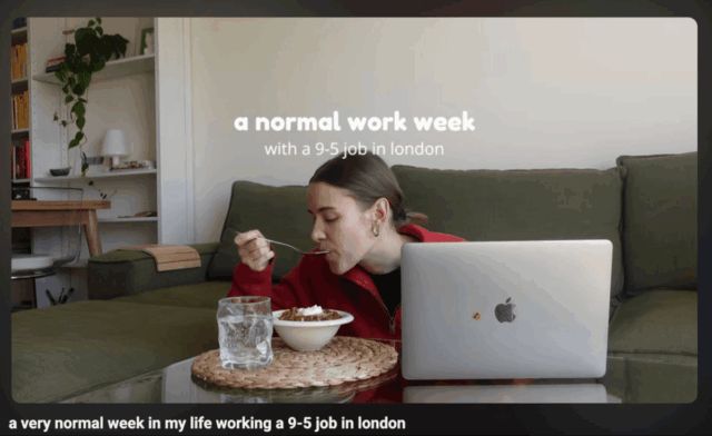 「9-5」がテーマのこの動画もクルミを散りばめた温かいポリッジのあるスローモーニングからはじまります。