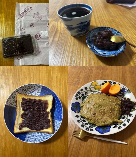 いろいろな食べ方を試しました。まずはコーヒーのお供として。喫茶店風のあんこトーストは、朝から贅沢な気分に。ほかにも、オートミールパンケーキに添えたり、餅好きのTaroのリクエストで焼き餅にのせたりと、幅広いアレンジが叶います。