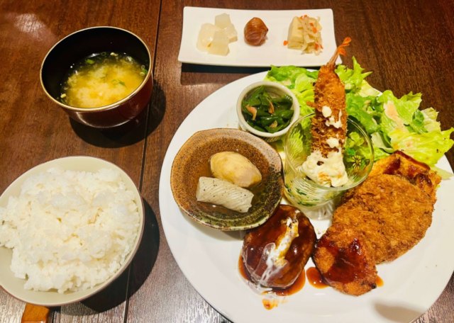 いただいたのは「喫茶去おまかせ洋食ランチ~亀岡牛100%海老芋コロッケ付き~」。高級京野菜として知られる海老芋は、ねっとりと甘く、頬が緩むおいしさでした。食後はコーヒーとクリスマスケーキを出していただいて、心踊るおいしい夜に。