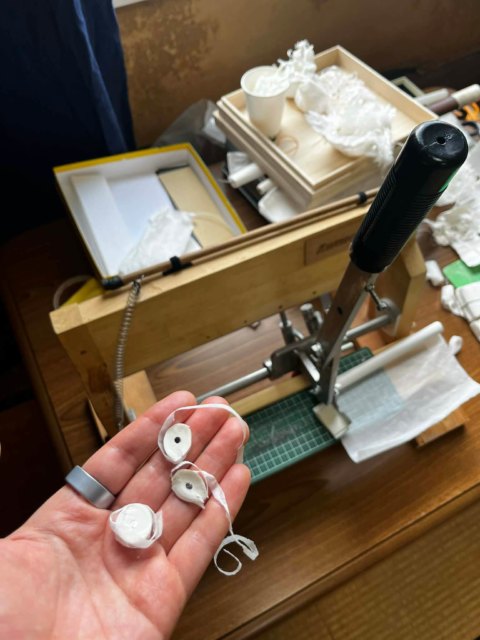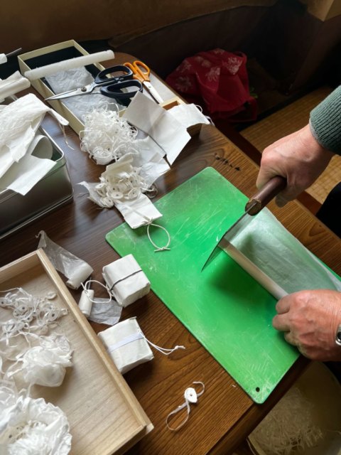 小さく丸めた和紙を十二個並べたものを三本、さらにそれを上下に配置して、合計六本分を束ねます。七十個以上の和紙の塊を束ねたものが、あの蜘蛛の糸になるのです。