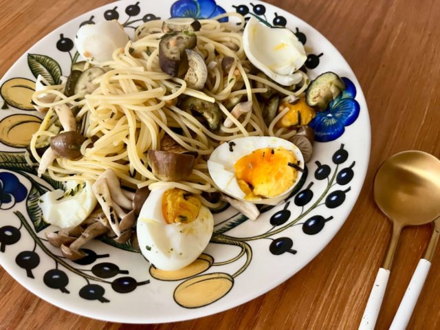 その日の一皿は、パスタ100gに茄子を1本、しめじを半パックほど加えて、野菜でかさを増しながら食べごたえを保つ。そしてゆで卵をふたつ。栄養を計算すると、パスタ100gでたんぱく質は約13g、ゆで卵ふたつで約12g前後。合計で25g以上となり、基準もクリア。脂質についても、パスタで約2.2g、卵で約12gに収まり、オイルを使っていないため一皿全体でも15g以内に収まる設計です。